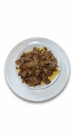 Schotel met döner gemaakt van biefstukvlees, friet of rijst, basisgroenten*, jalapenos, pepers, augurk en saus naar keuze.